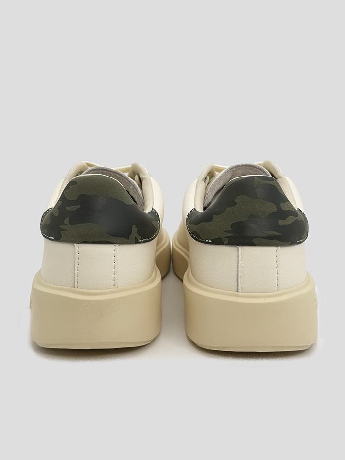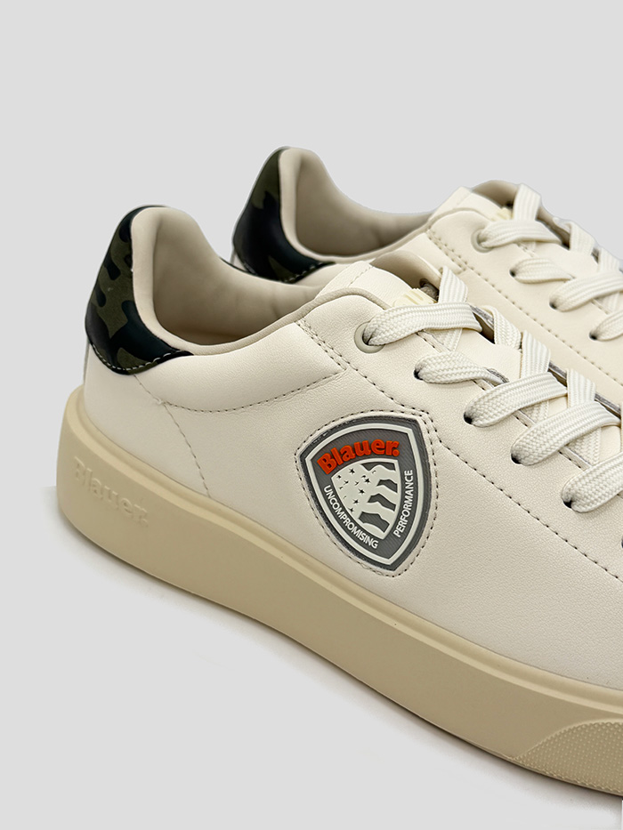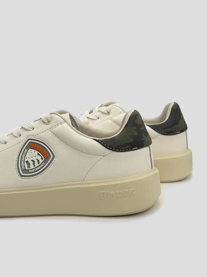 Sneaker en color blanco roto de la marca Blauer. Logo de la marca engomado en el lateral en color naranja. Cordones y suela al mismo tono. Talonera con estampado camuflaje.