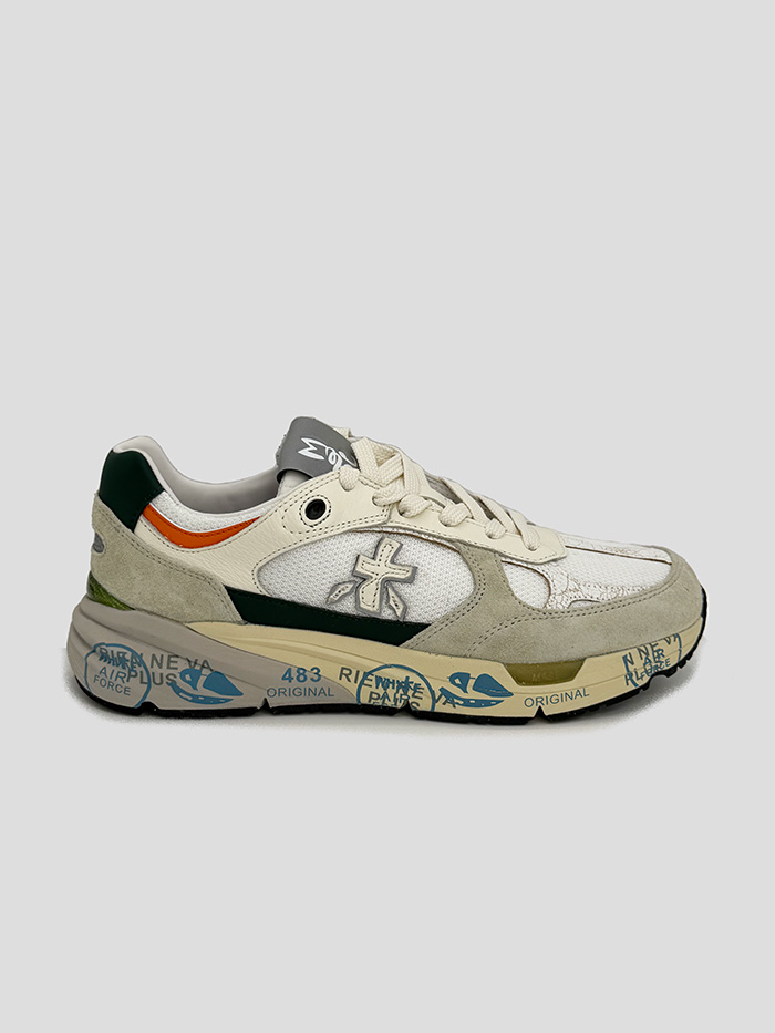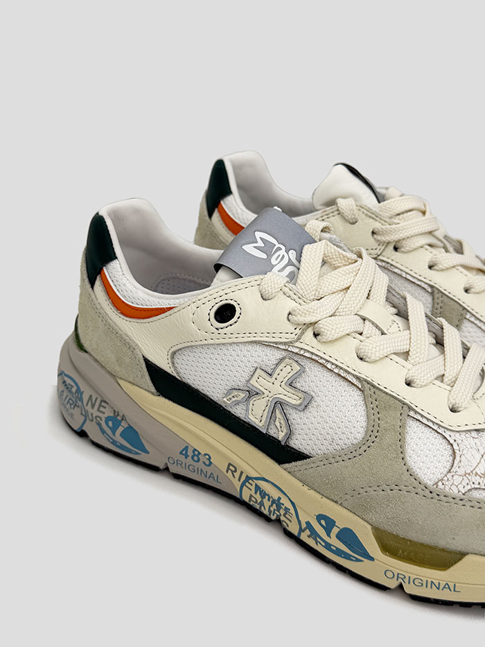 Sneaker para hombre modelo Mase 8111 de Premiata. Tejido exterior combinado con nalon y piel envejecida en color blanco. Puntera reforzada con ante en color gris. Detalles en color verde oscuro y naranja en la talonera.