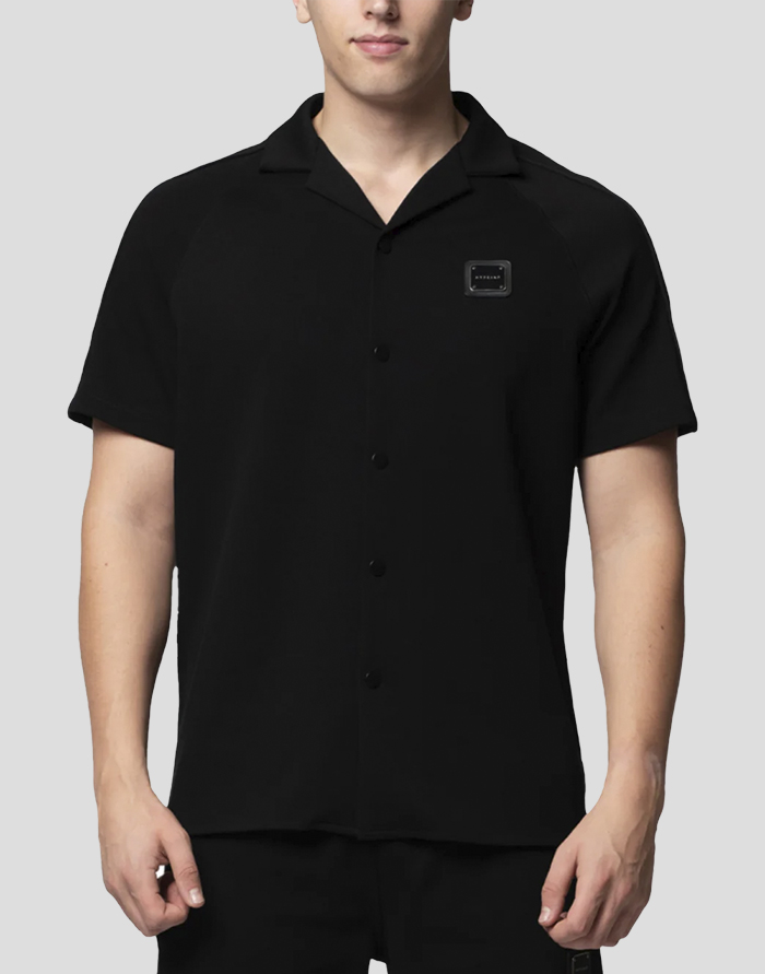 Blusa de la marca MY BRAND en piqué y en color negro. Placa del logo de la marca en pecho. Botones frontales.