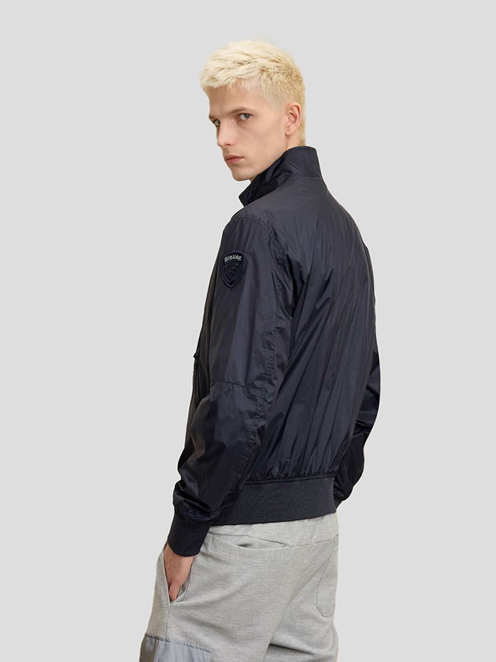 Bomber con cuello alto, modelo Brahms de la marca Blauer. Tejido técnico en color azul. Cierre con cremallera. Dos bolsillos externos, y un bolsillo en la manga izquierda. Dos bolsillos internos con cierre con velcro. Bajo de la prenda y puños elásticos.