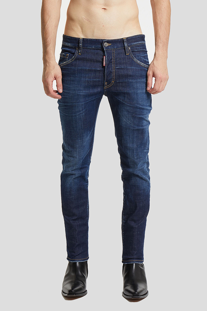 Jeans oscuro de la marca Dsquared2. Cinco bolsillos y cierre con botones. Distintivo rojo de la marca.