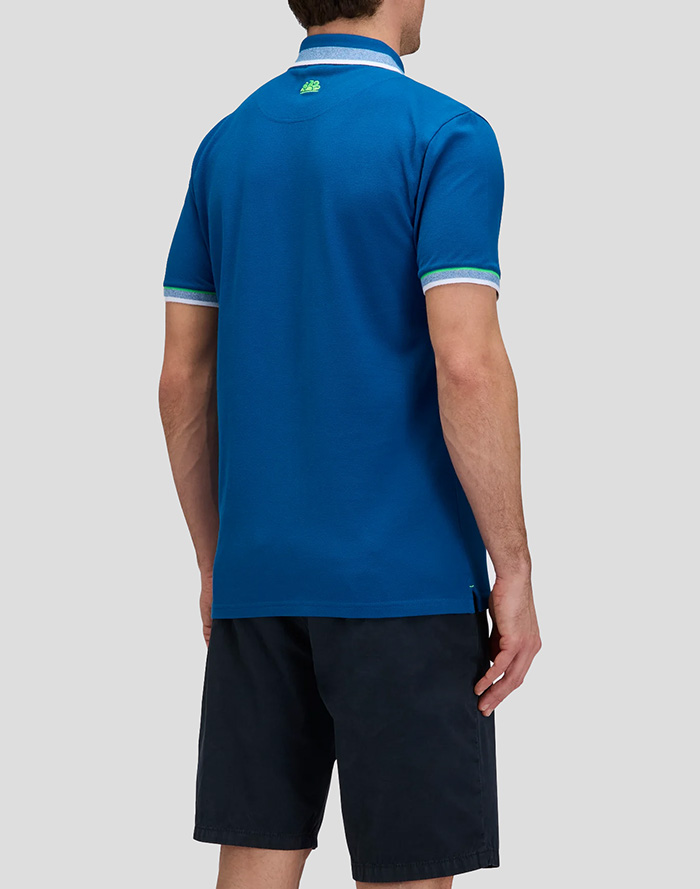 Polo en color azul de la marca Sundek. Banda tricolor en cuello y bajo de la manga. Logo en la solapa del cuello.