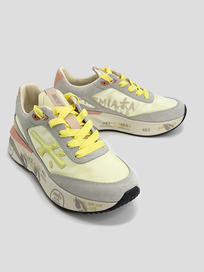 Sneaker para mujer modelo Moerun 8081 de la marca Premiata. Tejido exterior de nailon en color amarillo y puntera reforzada en piel efecto ante en color gris. Cordones en color amarillo. Su innovadora suela se caracteriza por ser uno de los modelos más ligeros de la marca aportando estabilidad y amoritiguación.