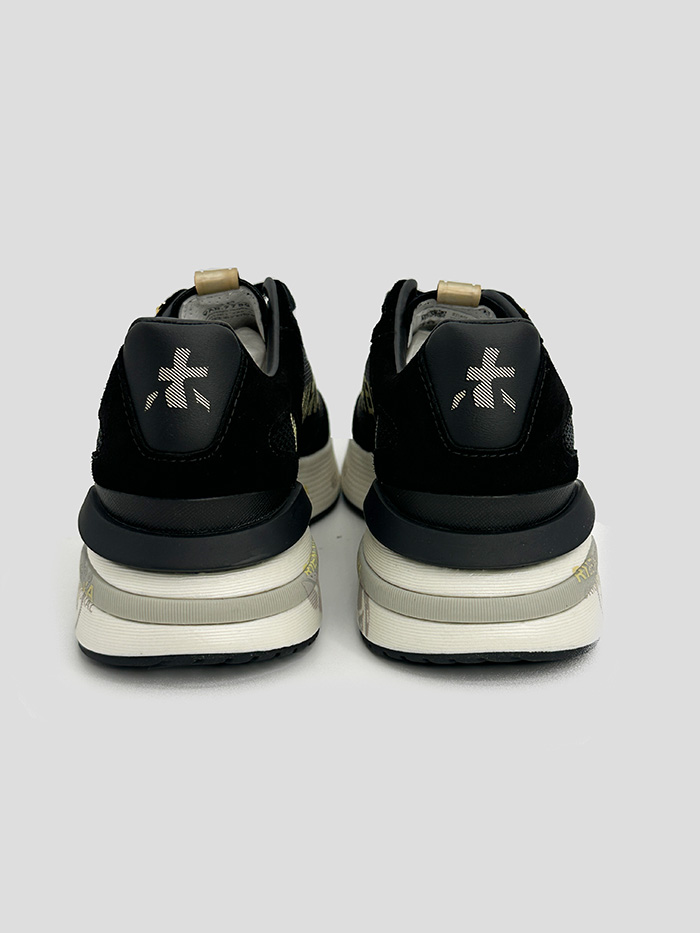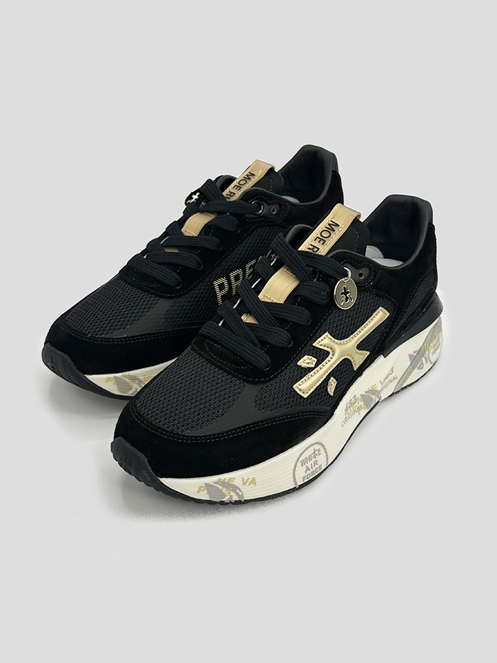 Sneaker para mujer en color negro modelo Moerund de la marca Premiata. Logo de la marca en el lado exterior en color dorado. Inscrita de la marca en el lado interno en color dorado. Cordones en color negro.