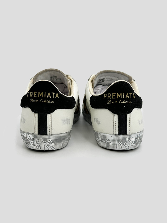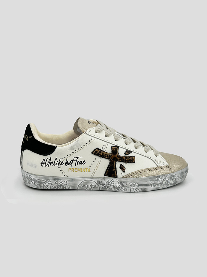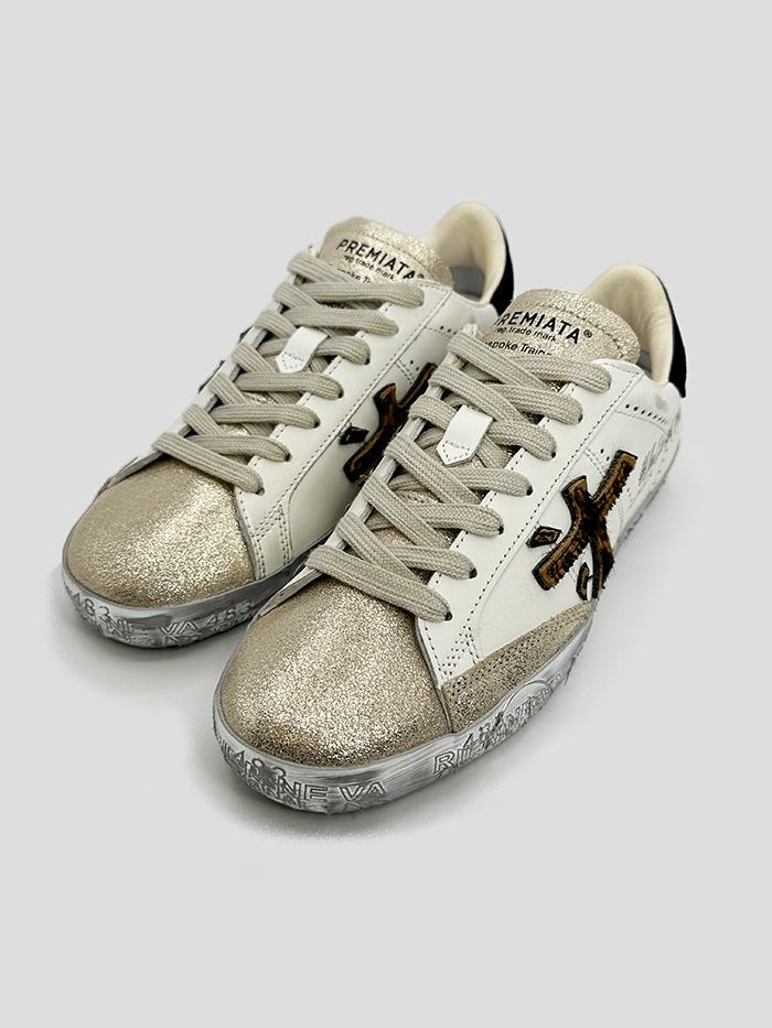 Sneaker para mujer, modelo Stevend de la marca Premiata. Logo de la marca en el lateral con pelo sintético efecto leopardo. Puntero y lengüeta con efecto glitter en color dorado. Talonera en color negro con logo en dorado.