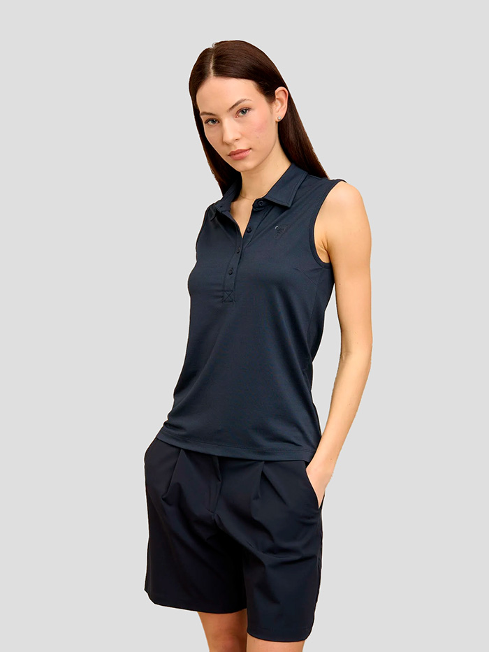Polo sin mangas en color azul marino de la marca Blauer. Cuello con solapa y cierre con botones. Logo de la marca estampado en el pecho con vinilo metalizado.