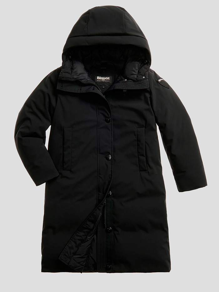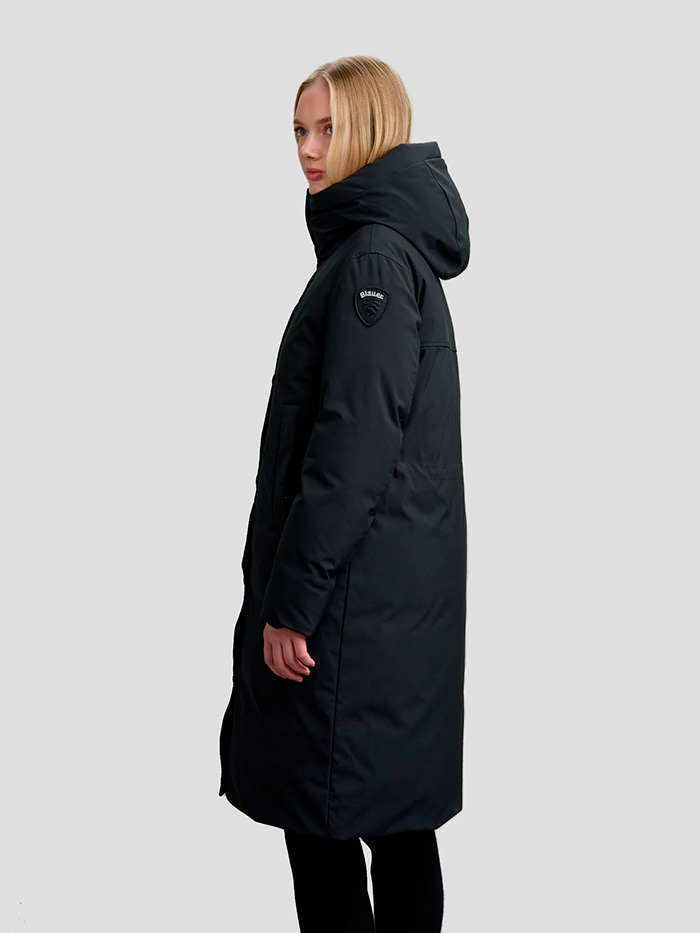 Parka larga en color negro con nailon repelente al agua y capucha fija, modelo Argyle de la marca Blauer. Acolchado pluma 90/10 gr.265. Cierre con cremallera y botones de presión. Dos bolsillos exteriores y dos bolsillos internos con cierre con velcro.