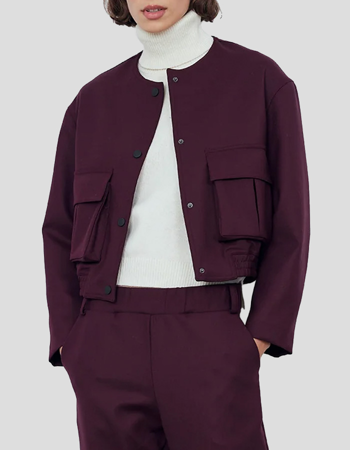 Bomber en color burdeos, modelo Teresa, de la marca Bad Habits. Cierre con snaps en negro y bolsillos laterales. Tejido: 59% Poliéster, 22% Lana Virgen, 17% Viscosa, 2% Elastano.