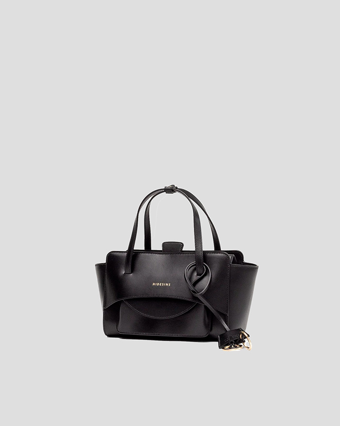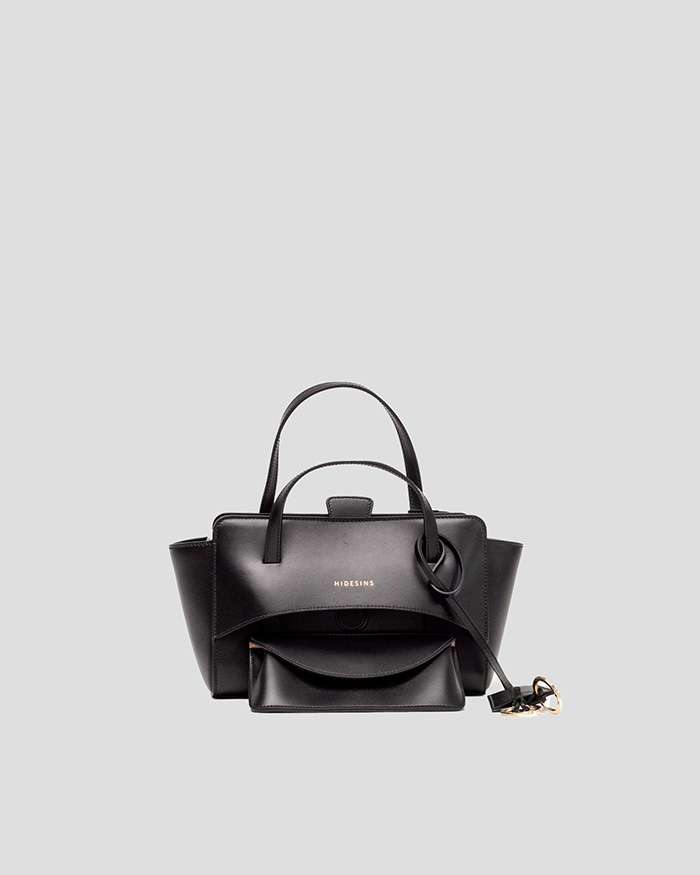 Bolso de piel en color negor, modelo Flap S de la marca Hidesins. Dos asas superiores y bandolera extraible. Cierre con botón magnético y cremallera. Bolsillo exterior extraible. Forro interno de algodón.