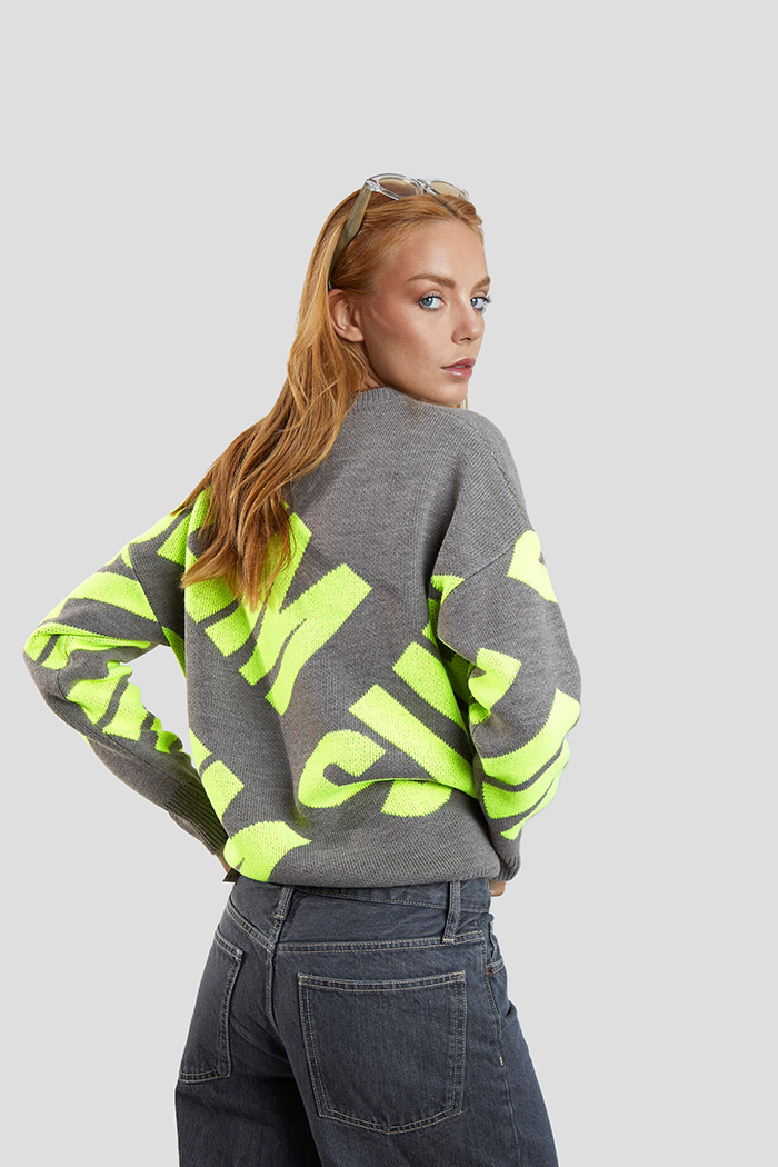 Jersey de la marca Sublim con fondo color beige, con cuello redondo y manga larga. Contiene la palabra SUBLIM en color pistacho flúor.