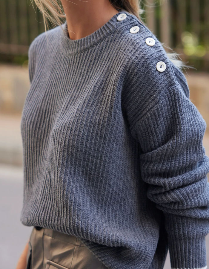 Jersey de punto, modelo Ophelia, en color gris de la marca Bad Habits. Detalle de botones en coor blanco en el hombro izquierdo. Bajo de puño y bajo de la prenda resaltado con una linia blanca.