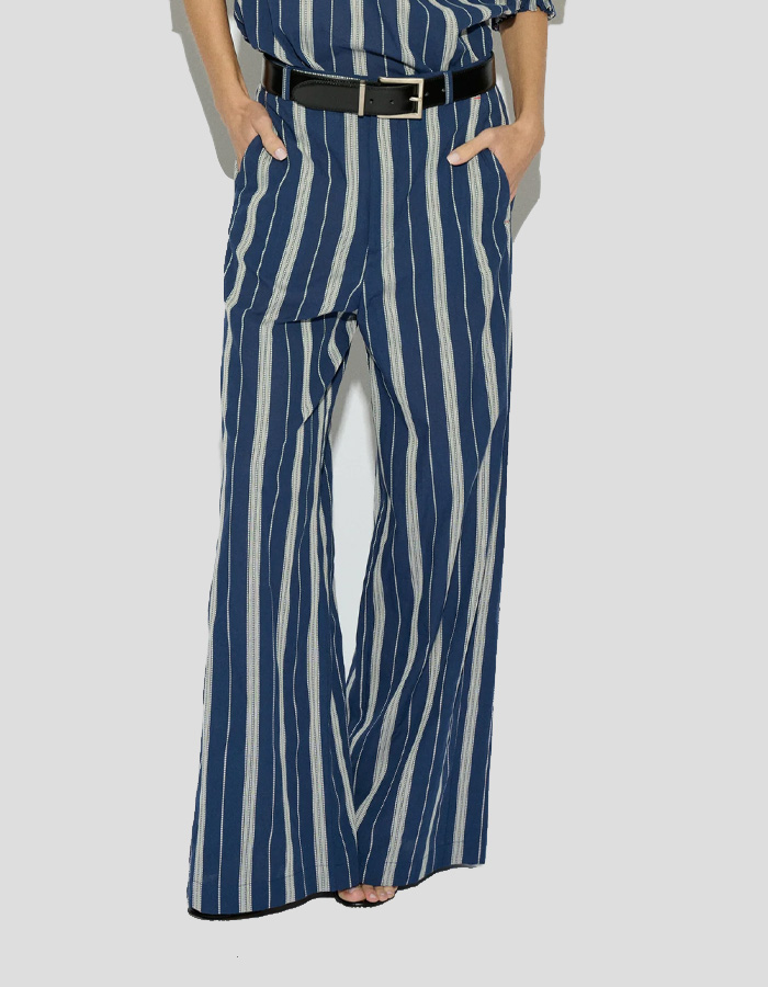 Pantalón recto modelo Almu de la marca Badits. En color azul con estampado a rayas. Tiro medio, dos bolsillos laterales y cintura con trabillas. Cierre frontal con cremallera y botón.