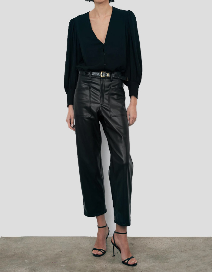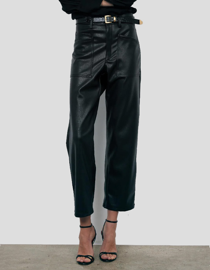 Pantalón de piel vegana en color negro de la marca Bad Habits. Tiro medio y corte relajado. Largo tobillero. Cierre con botón y cremallera. Dos bolsillos delanteros y dos bolsillos posteriores. Cintura con trabillas para poder llevarlo con cinturón. Composición: 60% PU y 40% poliéster.