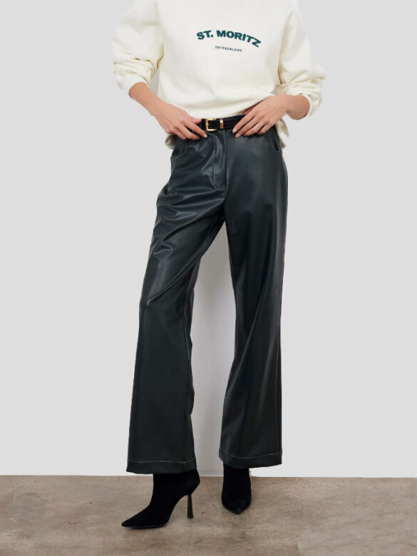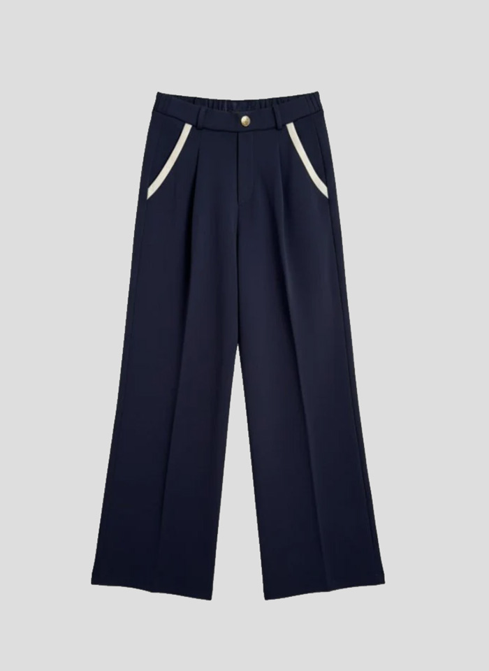Pantalón con pinzas y trabillas en color azul marino modelo Celia de la marca Bad Habits. Dos bolsillos laterales con borde en color crudo. Composición: 88% Algodón, 8% Poliéster, 4% Elastano.