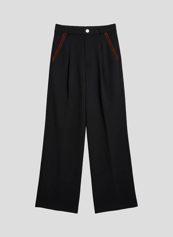 Pantalón con pinzas y trabillas en color negro modelo Celia de la marca Bad Habits. Dos bolsillos laterales con borde en color teja. Composición: 88% Algodón, 8% Poliéster, 4% Elastano.