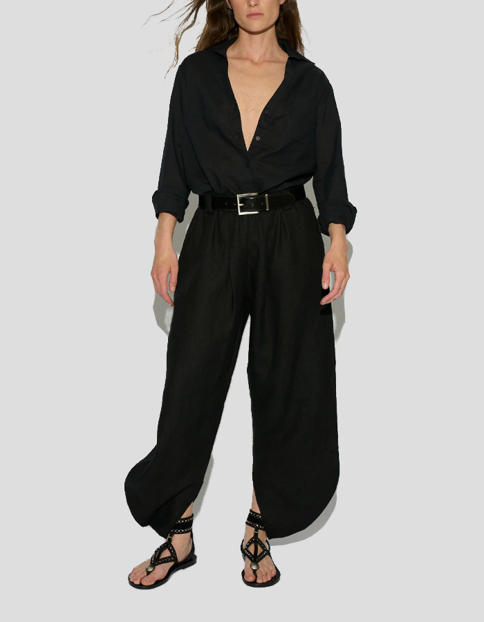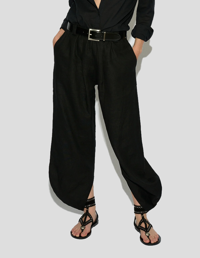 Pantalón de lino bombacho en color negro modelo Flavia de la marca Badits. Goma en la cintura.