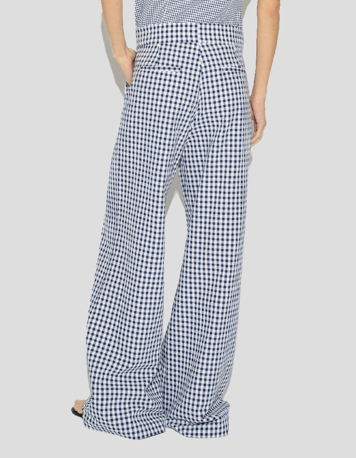Pantalón recto modelo Flora de la marca Badits. Estampado vichy en color azul . Pinzas delanteras y dols bolsillos laterales. Cierre mediante lazada con cordones del mismo tejido y botones interiores.