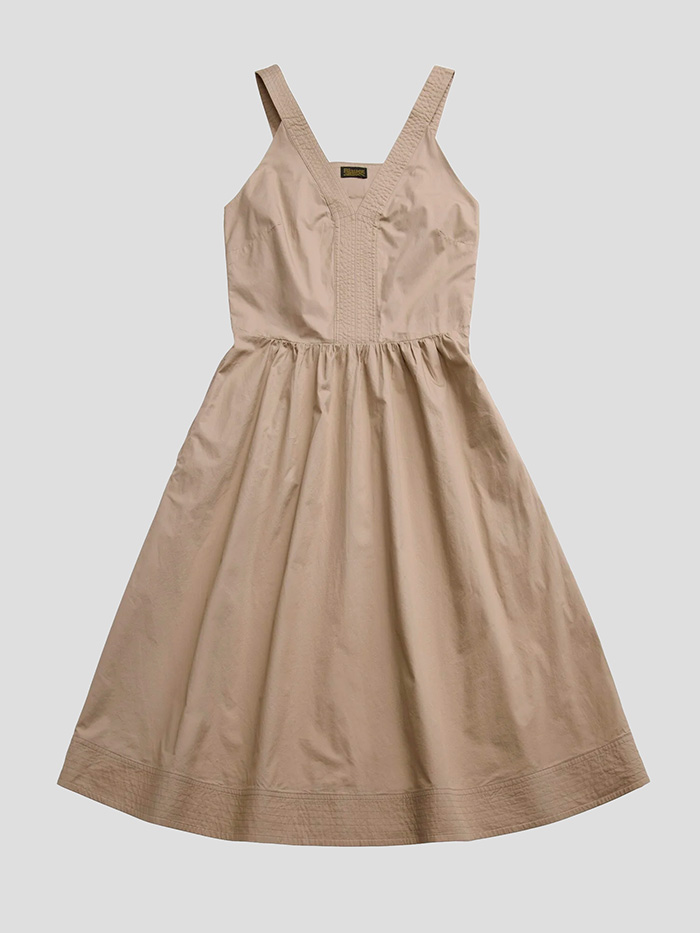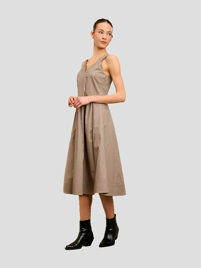Vestido de tirantes, en color beige, modelo Magdala de la marca Blauer. Efecto entallado, cremallera en el lateral. Bolsillos en los laterales.